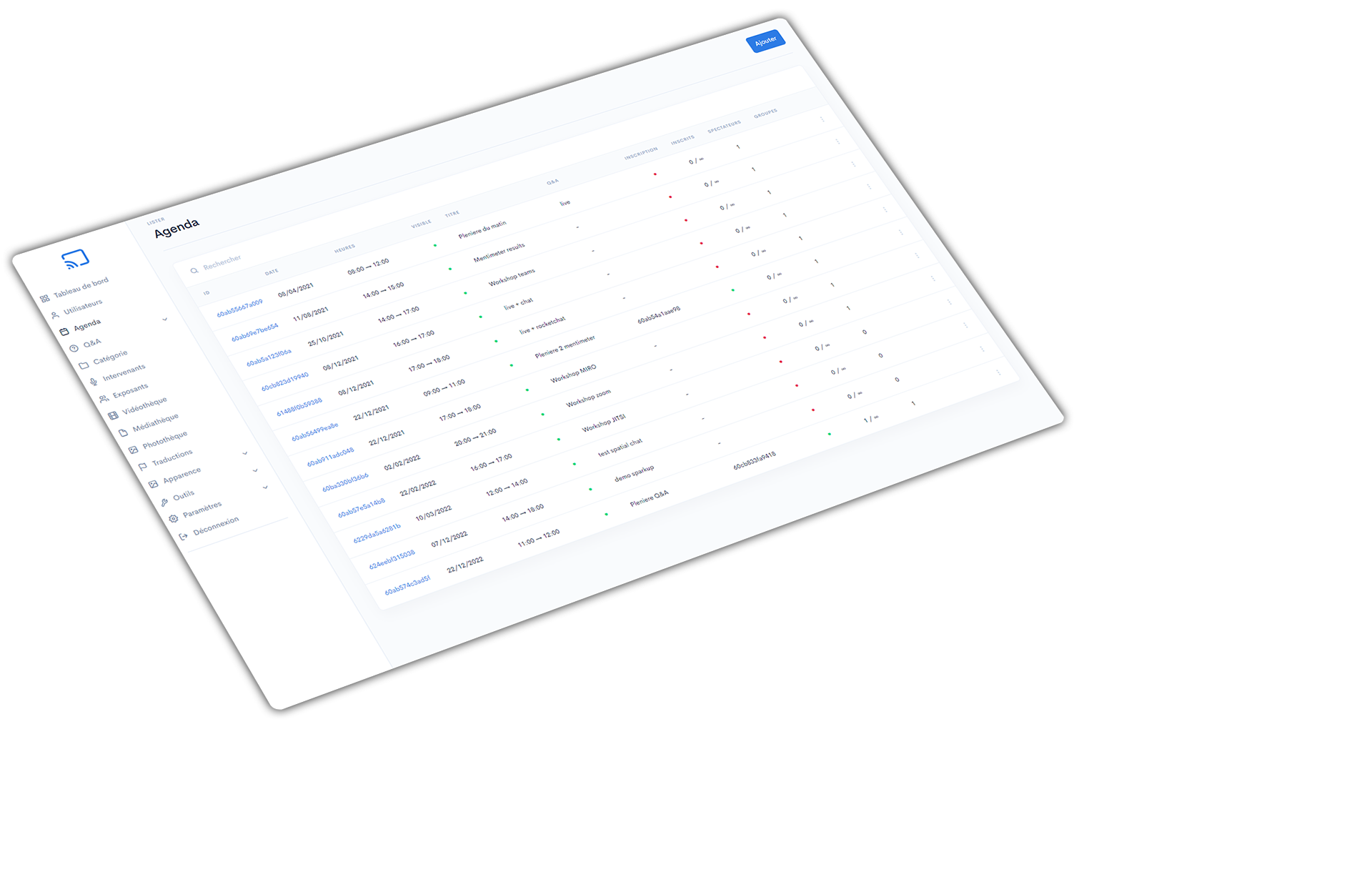 Que ce soit pour des événements en ligne, hybrides ou présentiels, nous offrons une expérience immersive avec streaming, interactions en temps réel et gestion complète des participants.