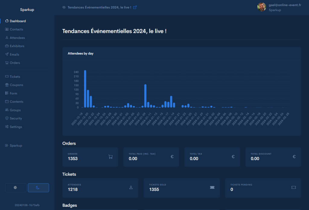 – Suivi en temps réel des inscriptions, scans et campagnes de mails – Tableau de bord de statistiques complet et segmenté – Export aux formats .xlsx, .csv et accès aux données via API