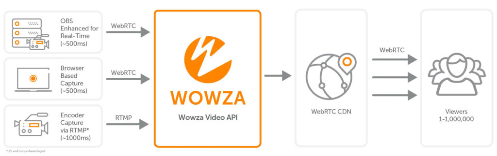 Grace au service RealTime@Scale de Wowza, il est possible de diffuser des flux vidéos en WebRTC en passant par un CDN spécifique à ce protocole permettant la diffusion à une très large audience (jusqu’à 1 million de spectateurs en temps réel).